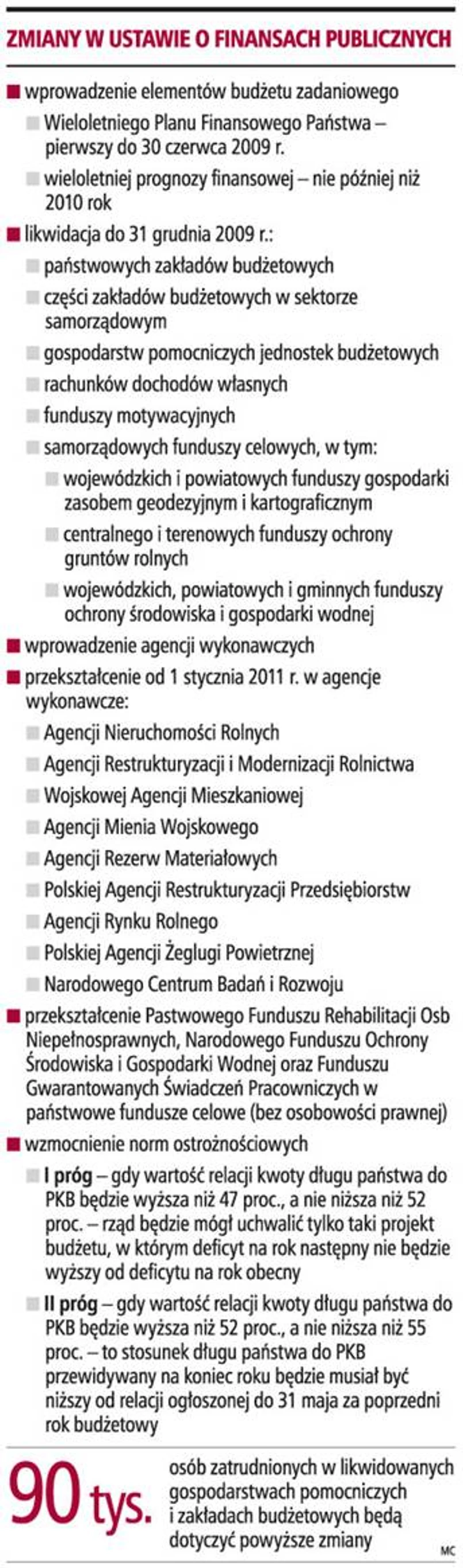 Jednym z zasadniczych celów nowej ustawy jest jawność i przejrzystość finansów publicznych. Oznacza to przebudowę sektora finansów, czyli likwidację państwowych zakładów budżetowych, części zakładów budżetowych w sektorze samorządowym, gospodarstw pomocniczych jednostek budżetowych, samorządowych funduszy celowych oraz przekształcenie niektórych agencji w agencje wykonawcze, czyli w nową formę organizacyjną. Nie są to nowe propozycje, jednak jak już wcześniej podkreślało wielu ekspertów od finansów publicznych, są one konieczne, ponieważ spowodują ujawnienie środków publicznych, którymi dysponują te jednostki, oraz zwiększenie kontroli nad nimi. Likwidacja zakładów i gospodarstw wymaga jednak ustalenia, co stanie się z pracownikami tych jednostek oraz kto przejmie ich zadania. Ustawa wprowadzająca przewiduje, że likwidacja zakładów i gospodarstw zakończy się 31 grudnia 2009 r. Pracownicy będą albo zatrudniani w innych jednostkach, albo zostaną zwolnieni z pracy. Istotna zmiana dotyczy jednak dotychczas wykonywanych zadań przez gospodarstwa pomocnicze i zakłady budżetowe. Zadania te przejmą jednostki macierzyste albo - jak czytamy w uzasadnieniu - będą wykonywane w innej formie. Nowością jest natomiast możliwość zakupu usług w sektorze prywatnym. Resort finansów przewiduje, że zamawianie usług na zewnątrz sektora wpłynie na pojawienie się konkurencji, a w konsekwencji spadek ich cen. W przypadku zakładów budżetowych w sektorze samorządowym ograniczono zakres zadań do spraw dotyczących: gospodarki mieszkaniowej, wodociągowo-kanalizacyjnej, zaopatrzenia w energię, sportu oraz cmentarzy.