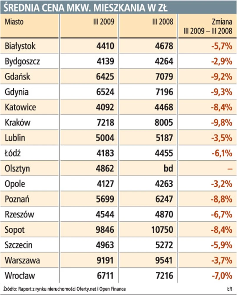 Zdaniem analityków serwisu Oferty.net na sprzedaż decydują się tylko ci, którzy potrzebują szybko gotówki. Ostrożnie zachowują się również kupujący. Przede wszystkim z powodu coraz ostrzejszych warunków udzielania przez banki kredytów hipotecznych. Zakupom nie sprzyjają zapowiedzi kolejnych spadków cen mieszkań. Ceny mieszkań we wszystkich miastach analizowanych przez serwis Oferty.net są niższe niż rok temu. Spadek waha się od dwóch do blisko dziesięciu procent.