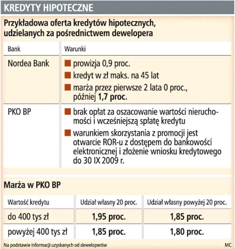 Tak jak przy zwykłym kredycie trzeba więc posiadać odpowiednie dochody i zabezpieczenie. Za pośrednictwem dewelopera kredyt może być jednak tańszy. W Polnordzie przy kredycie mieszkaniowym z Noredea Bank marża przez pierwsze dwa lata nie jest pobierana, a potniej wynosi 1,7 proc. Marża przy pożyczkach mieszkaniowych PKO BP, oferowana w tej samej firmie, wynosi od 1,8 do 2 proc. Podobna oferta kredytowa PKO BP jest też w Dom Development.
