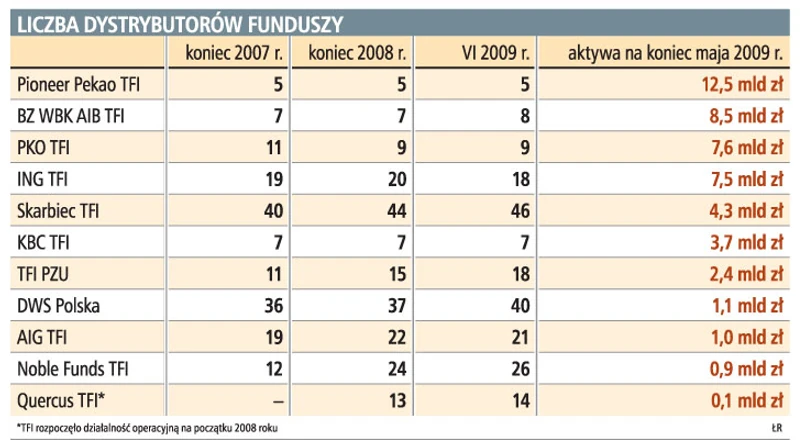 Najmniejszą liczbą dystrybutorów na rynku dysponują największe, należące do banków TFI, ale to ich sieci sprzedaży są najbardziej rozległe. Korzystają bowiem z placówek całej grupy finansowej. Np. Pioneer Pekao TFI ma tylko pięciu dystrybutorów, ale jego fundusze można kupić w ponad 1000 placówek. Ale bankowe TFI nadal szukają pomysłów na poszerzenie dystrybucji.