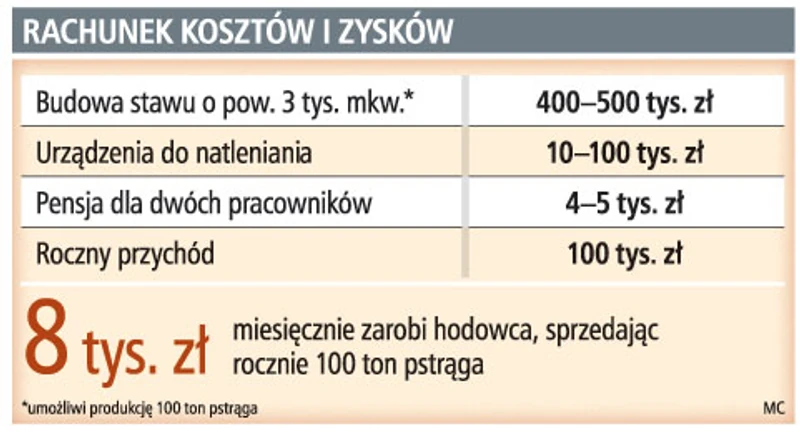 Dziś hodowla ryb jest nieco bardziej opłacalna niż rok, dwa lata temu, kiedy to wysokie ceny zbóż wpływały na znaczny, nawet 60-proc. wzrost kosztów produkcji (zboża to podstawowy składnik paszy). Mimo to na pierwsze zyski hodowcy muszą czekać jednak nieraz od roku do nawet trzech lat. Potem, jeśli zapewnią sobie skup, mogą liczyć na zarobek nawet ponad 8 tys. zł miesięcznie.