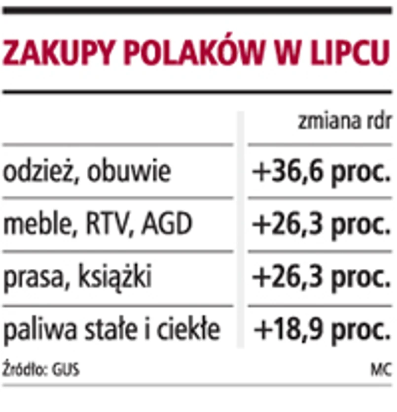 Konsensus rynkowy dla sprzedaży detalicznej w lipcu wynosił ok. 14 proc. rok do roku. Z danych podanych przez GUS wynika, że najszybciej rośnie sprzedaż mebli, sprzętu RTV i AGD, prasy, książek, a także - co związane jest zapewne z sezonowymi wyprzedażami - odzieży i obuwia. Natomiast słabiej sprzedawały się samochody.