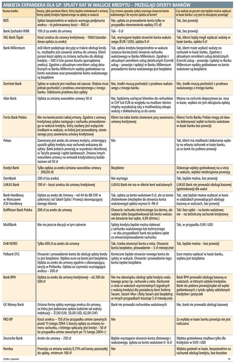 Sprawdziliśmy, jakie warunki spłaty kredytów zaproponują banki od 1 lipca i jakie koszty będą musieli ponieść kredytobiorcy, którzy zdecydują się skorzystać z Rekomendacji SII Komisji Nadzoru Finansowego. Już wcześniej spłaty w walucie mogli dokonywać klienci Dominet Banku, Fortis Banku, DB PBC oraz Banku BPH. Od środy taką możliwość będą mieli też klienci pozostałych banków.