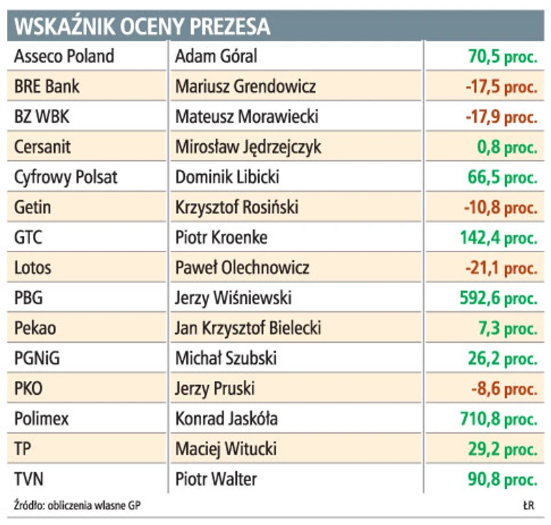Z przygotowanego przez nas zestawienie wynika, że najlepiej kierowanymi spółkami są Polimex i PBG oraz GTC. W zestawieniu uwzględniliśmy tylko te spółki z WIG20, których prezesi zasiadają w fotelach co najmniej rok. Wychodzimy bowiem z założenia, że w pierwszym okresie po zmianie szefa spółki kurs akcji uwzględnia nadzieje lub obawy inwestorów, a dopiero po kilku, kilkunastu miesiącach uznają, że mogą ocenić efekty ich pracy.