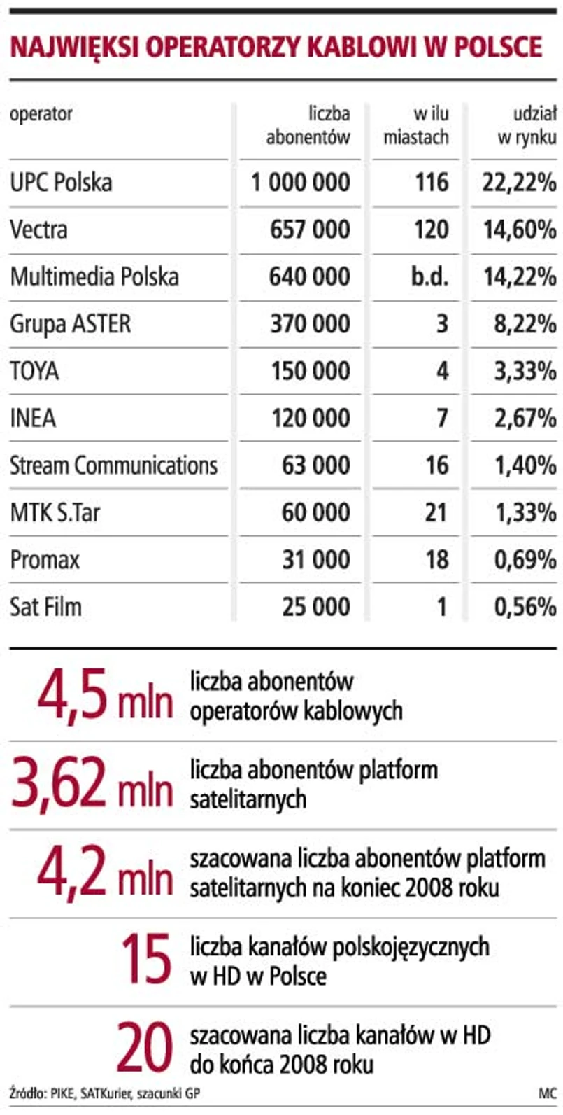 Impet, dzięki telewizji cyfrowej, odzyskali operatorzy kablowi. Ich oferta programowa jest konkurencyjna dla platform, a do tego kablówki oferują dostęp do internetu i telefonii stacjonarnej. U czterech największych graczy - UPC Polska, Vectra, Multimedia i Aster - z telewizji cyfrowej korzysta dziś w sumie 260 tys. abonentów. Do końca roku liczba ta może przekroczyć 300 tys. Przychody największych operatorów wzrosną natomiast od kilkunastu do 20 proc.