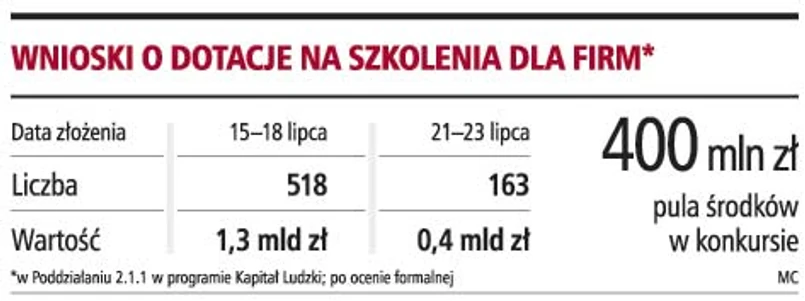 Wszystko przez jeden zapis w dokumentacji, według którego wnioski złożone w pierwszym tygodniu kalendarzowym konkursu należy ocenić jako pierwsze, a firmom, które uzyskają minimalną wymaganą liczbę punktów, przyznać dotacje. Dopiero potem będą oceniane projekty złożone w kolejnych tygodniach. Najbardziej ucierpią osoby, które chciały skorzystać z cieszących się olbrzymią popularnością dotowanych studiów podyplomowych. Większość projektów, które zakładały ich uruchomienie, znalazła się z drugiej turze.