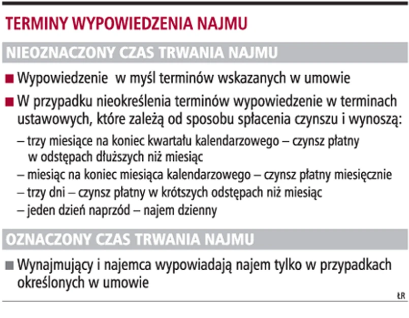 - Przy oznaczonym czasie trwania najmu zarówno wynajmujący, jak i najemca mogą wypowiedzieć najem tylko w przypadkach, które są określone w umowie. Natomiast nie mogą tego zrobić bez powodu tylko z zachowaniem terminów umownych wskazanych w umowie najmu albo terminów ustawowych przewidzianych w kodeksie cywilnym - tłumaczy radca prawny Piotr Olczyk z kancelarii Olczyk & Kubicki.