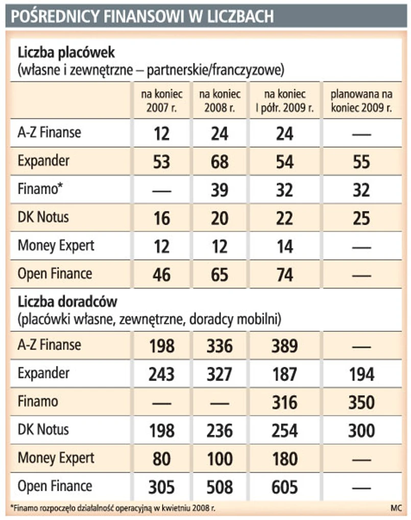 Przedstawiciele firm dodają, że pod względem finansowym trudno jednak mówić o jednorodnej sytuacji w branży. Wiele zależy nie tylko od wsparcia ze strony właścicieli, ale też od formuły, w jakiej działają. Pośrednicy często stosują tzw. formuły nisko kosztowe. Tak działa np. A-Z Finanse, gdzie większość doradców prowadzi działalność gospodarczą. Po podpisaniu umowy reprezentują firmę na zewnątrz w zamian za prowizję ze sprzedaży.