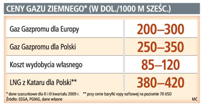 Gdybyśmy już dziś zaopatrywali się w skroplony gaz ziemny z Kataru jego 1 m sześc. byłby nawet o ponad 30 gr droższy od ceny, jaką za to paliwo płacimy od czerwca bieżącego roku. Przy aktualnych notowaniach ropy naftowej i kursie dolara za LNG zapłacilibyśmy bowiem około 1,13–1,28 zł/m sześc., i to jeszcze przed regazyfikacją, czyli przekształceniem skroplonego paliwa ponownie w gaz. Tymczasem cena zużywanego obecnie w Polsce gazu – zgodnie z taryfą Polskiego Górnictwa Naftowego i Gazownictwa (PGNiG) – wynosi 0,92–0,95 zł/m sześc.