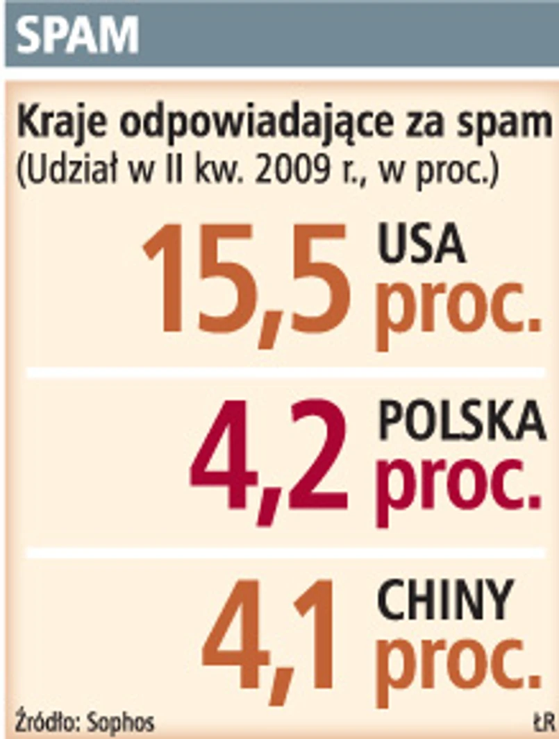 Co 25 niechciana wiadomość pochodzi z polskich komputerów, głównie od klientów Telekomunikacji Polskiej. Odpowiadamy już za 4,2 proc. światowego spamu, wyprzedzamy Chiny (4,1 proc.). W II kwartale w porównaniu z I kwartałem Polska odnotowała największy jednorazowy skok liczby wysyłanego spamu i przesunęła się z dziesiątej pozycji na szóstą – informuje Sophos, firma zajmująca się bezpieczeństwem IT.