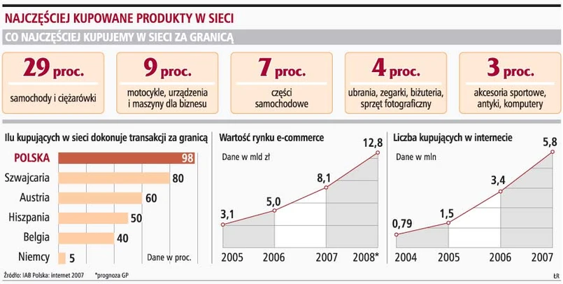Firmy żyjące z e-handlu nie boją się spowolnienia gospodarki i prognozują, że rynek wzrośnie w 2008 roku o 60 proc. Jeśli Polacy nie ograniczą zakupów, wartość internetowego handlu wzrośnie w tym roku do 12,8 mld zł. Silny wzrost wydatków na zakupy przez internet za granicą to efekt umocnienia się złotego.