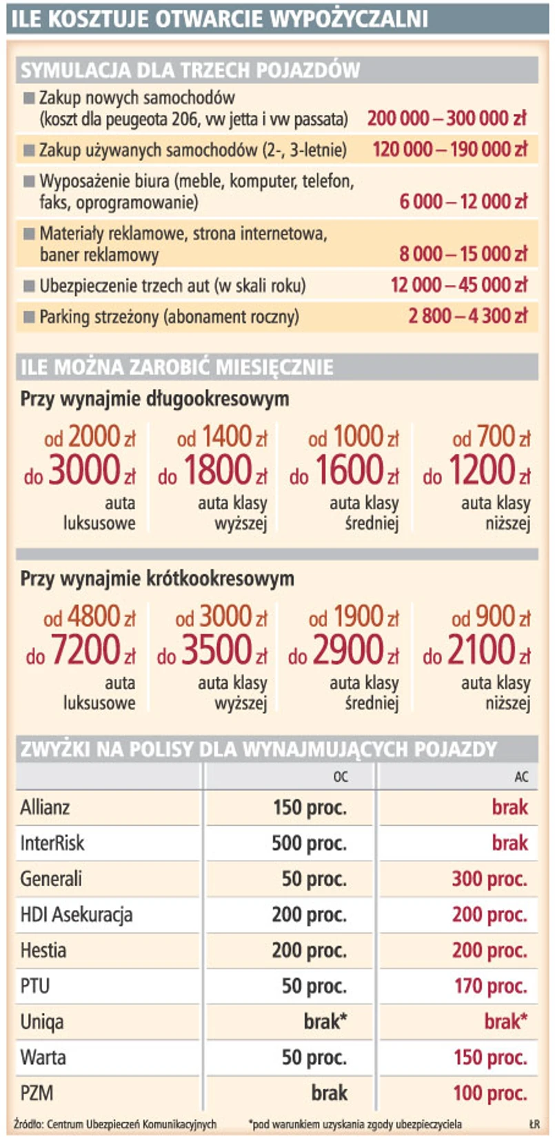 Zwykle koszty pakietu ubezpieczeniowego wahają się od 3 do 10 proc. wartości auta, w zależności np. od jego wieku, wybranego zakresu ochrony i profilu klienta. Jednak osoby czy firmy zajmujące się wynajmowaniem samochodów muszą płacić nawet kilka razy więcej. Towarzystwa uznają ubezpieczanie takich aut za szczególnie ryzykowne, bo zmieniający się kierowcy o auto pożyczone dbają mniej niż o swoje. Dlatego niektóre towarzystwa naliczają nawet 500 proc. zwyżki za ubezpieczenie takiego samochodu, zwykle 50–200 proc.