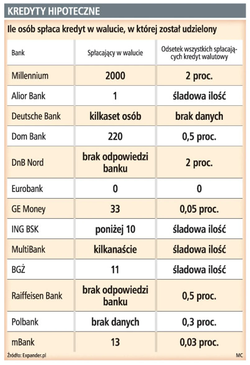 Z raportu Expandera wynika, że najwięcej osób zdecydowało się na to w banku Millennium: 2 tys. osób, czyli 2 proc. wszystkich kredytobiorców, którzy wzięli kredyt walutowy w tym banku. Podobny odsetek klientów zmienił sposób spłaty w DnB Nord.