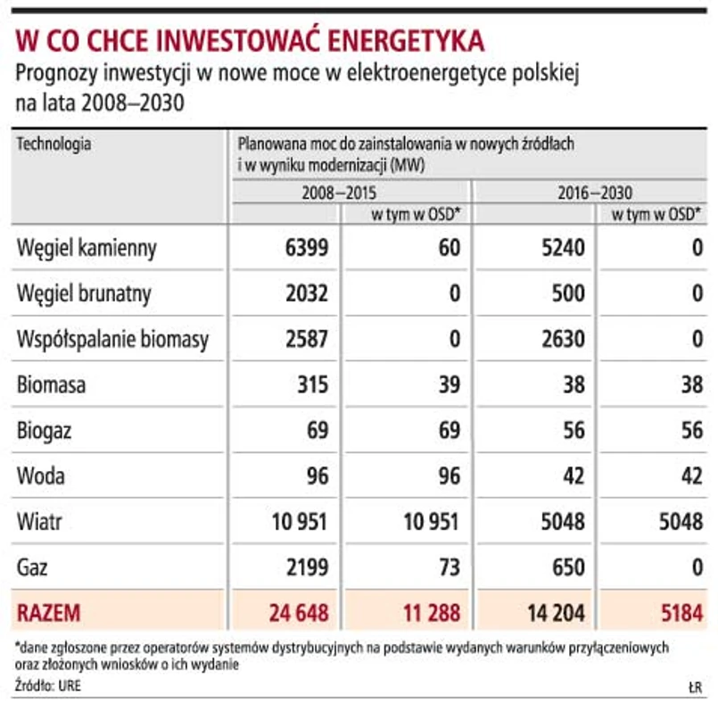 Urząd Regulacji Energetyki przeprowadził badania ankietowe elektroenergetyki i wynika z nich, że po uwolnieniu cen dla przemysłu z początkiem tego roku branża budzi się z inwestycyjnego letargu. Energetycy zadeklarowali, że w latach 2008-2030 zainwestują 135 mld zł, z czego 86,5 mld zł w latach 2008-2015. Zdecydowana większość pieniędzy ma być przeznaczona na budowę nowych mocy - w latach 2008-2030 to około 105 mld zł. Inwestycje te mogą być jednak niedoszacowane, bo liczone po koszcie 1,5 mln euro za 1 MW, a już teraz ceny sięgają 1,8-1,9 mln euro i to bez kosztów instalacji wychwytywania CO2. Są też niestety opóźnione, więc nie rozwiążą szybko problemu brakujących mocy wytwórczych.