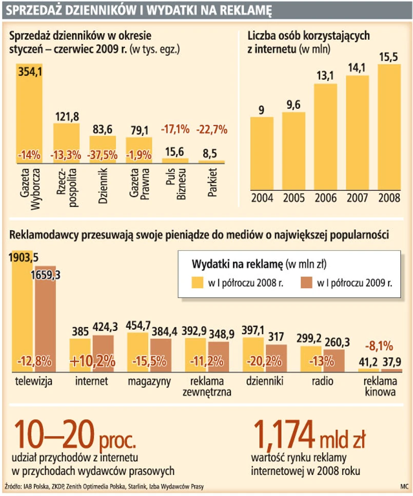 Wydawcy prasy mają za sobą trudne I półrocze, a przed sobą jeszcze trudniejszą drugą połowę roku. Sprzedaż gazet – co potwierdzają opublikowane wczoraj dane sprzedaży przez Związek Kontroli Dystrybucji Prasy – spadła w I półroczu wszystkim tytułom. A z powodu recesji o 20 proc. skurczyły się też wydatki reklamowe w gazetach. Dlatego wszyscy wydawcy stawiają dziś na internet. Inwestują w nowe serwisy, ale jednocześnie mocno postawili na ochronę ich praw autorskich w sieci.