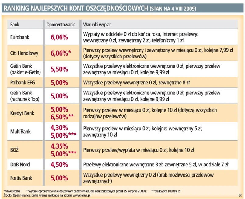 Oprocentowanie pieniędzy na kontach oszczędnościowych w wielu bankach jest często porównywalne z oprocentowaniem lokat bankowych. Jak wynika z rankingu przygotowanego przez Open Finance, najwyższe odsetki można uzyskać w Euro Banku i w City Handlowym. Oprocentowanie konta oszczędnościowego wynosi tam 6,06 proc. w skali roku.