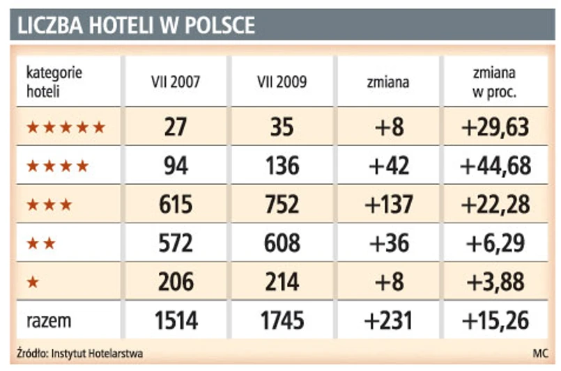 Jak wynika z ostatniego raportu Cushman & Wakefield, w II kwartale tego roku powstało pięć cztero- i pięciogwiazdkowych obiektów. Z kolei, jak zauważają analitycy z Instytutu Hotelarstwa, na przestrzeni ostatnich dwóch lat powstało ich 53, z czego nowowybudowanych 39. To o sześć więcej niż hoteli dwu- i jednogwiazdkowych. Ten trend powinien zostać utrzymany.