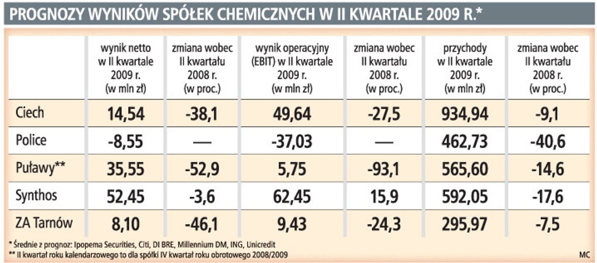 Znacznie większe spadki zysków zanotują najprawdopodobniej Ciech, ZA Tarnów i Puławy (dla tej ostatniej spółki II kwartał kończy rok obrotowy).
