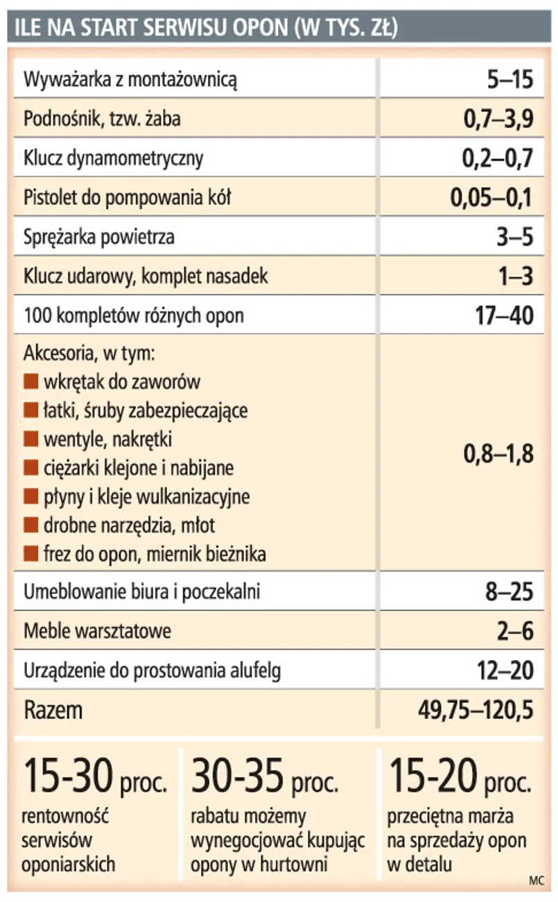 Ich koszt nie powinien przekroczyć 15 tys. zł. Do tego na wyposażeniu serwisu muszą znaleźć się podnośnik wulkanizacyjny, kompresor, klucze pneumatyczne, komplet narzędzi oraz niezbędne akcesoria (np. wkrętak do zaworów, łatki, śruby zabezpieczające, wentyle, nakrętki, ciężarki klejone i nabijane do felg stalowych i aluminiowych, płyny i kleje itp.).