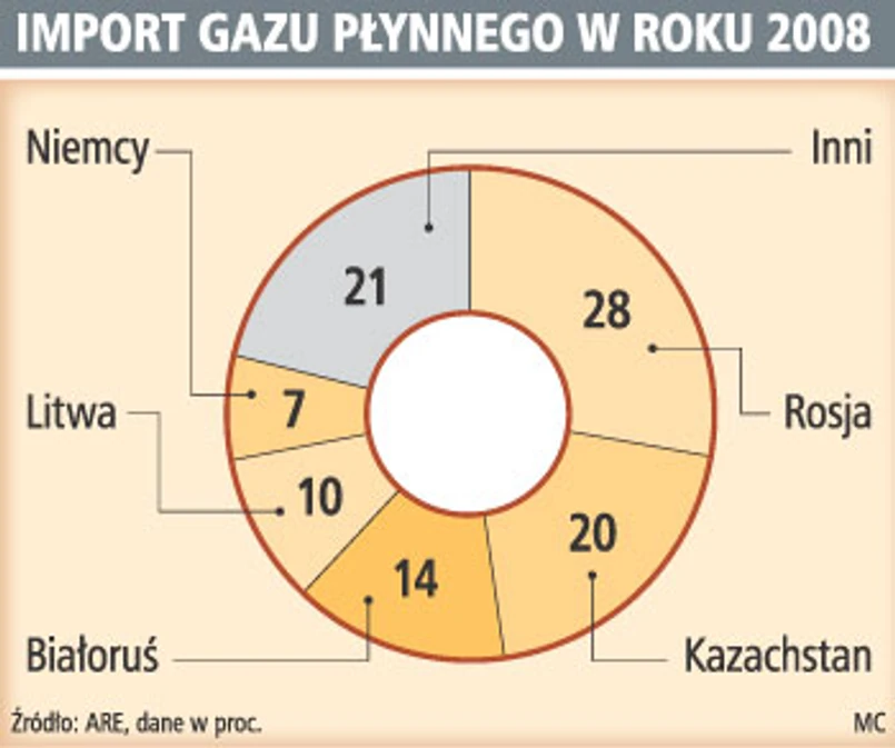 Od kogo w takim razie Polska jest uzależniona w zakresie importu gazu płynnego? Według danych zgromadzonych przez Polską Organizację Gazu Płynnego (POGP) największy udział w imporcie LPG do Polski ma wciąż Rosja. W 2008 roku jej udział w imporcie wyniósł 28 proc., podczas gdy rok wcześniej 25 proc., a dwa lata temu był to poziom 29 proc. Kolejni dostawcy to Kazachstan – 20 proc., Białoruś – 14 proc., Litwa – 10 proc., Niemcy – 7 proc. Warto odnotować wzrost importu z Litwy. Jest to rezultat zakończenia problemów związanych z pożarem w rafinerii w Możejkach.