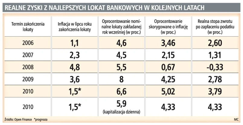 Warto więc zwrócić uwagę nie tylko na nominalne, ale też na realne zyski, przy których obliczaniu uwzględnia się poziom inflacji. Wczoraj GUS poinformował, że w ostatnich 12 miesiącach ceny towarów i usług wzrosły o 3,6 proc. Na dodatek rzeczywisty zarobek klienta obniżany jest także przez 19-proc. podatek od zysków kapitałowych. W rezultacie realne zyski z depozytów są ponad dwa razy niższe, niż wynika z nominalnego oprocentowania. Przy czym o zarobku można mówić w przypadku najlepszych lokat. Depozyty w bankach, które oferowały odsetki w wysokości 3–4 proc., nie przyniosły zarobku.