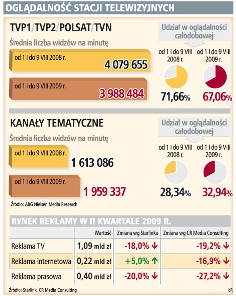 Właściciel Polsatu Zygmunt Solorz-Żak przyznał w rozmowie z GP, że ten trend może się jeszcze pogłębić w kryzysie. Widzowie chętniej niż dotychczas szukać mogą czegoś ciekawego w stacjach tematycznych, bo oferta głównych największych anten może stracić na atrakcyjności z powodu oszczędności wymuszonych przez recesję na rynku reklamy.