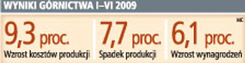 Spadek wydobycia i sprzedaży przy wysokim poziomie kosztów stałych oznaczają wzrost kosztów produkcji węgla. Po czerwcu koszty podstawowej działalności górnictwa wzrosły o 9,3 proc., przy spadku produkcji o 7,7 proc. Wynagrodzenia wyniosły łącznie prawie 4,3 mld zł i były wyższe o 6,1 proc. niż w analogicznym okresie 2008 r.