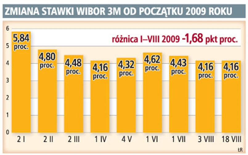 Z obecnej sytuacji na rynku międzybankowym korzyść już teraz odnoszą kredytobiorcy, którzy mają kredyty w złotych i ich oprocentowanie zależy od stawek obowiązujących na naszym rynku międzybankowym. Stawka WIBOR 3M spadła od początku roku o ponad 1,5 pkt proc. (z 5,84 do 4,16 proc.). Jest to w równej części efekt wzrostu zaufania między bankami, jak i obniżenia stóp procentowych w Narodowym Banku Polskim (od początku roku spadły one o 0,75 pkt proc.).