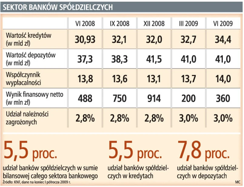 W Polsce działa 578 banków spółdzielczych i nie mają one problemów, z którymi boryka się sektor komercyjny, czyli wartość ich depozytów jest znacznie większa niż wartość udzielonych kredytów. O ile sektor spółdzielczy na koniec czerwca udzielił 34,4 mld złotych kredytów, to jego klienci zdeponowali na kontach i lokatach 41 mld złotych.