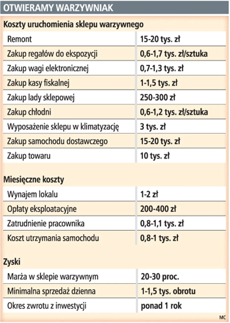 Sklep warzywny działający na osiedlu powinien być otwarty minimum do godziny 19.00, aby dać szansę zrobienia zakupów wracającym z pracy później. Powinien też funkcjonować w soboty. Długie godziny otwarcia wiążą się z koniecznością zatrudnienia pracownika. Na ten cel trzeba przeznaczyć około 800–1100 zł miesięcznie. Kolejne 10 tys. zł trzeba przeznaczyć na zakup towaru.