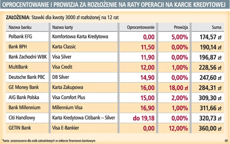 Część kart kredytowych posiada funkcjonalność pozwalającą na rozłożenie wykonanych za jej pomocą operacji na niskooprocentowane raty. Najtańsze raty na karcie oferuje obecnie Polbank, który zwyciężył w najnowszym Rankingu kart kredytowych Gazety Prawnej i Expandera. Standardowe oprocentowanie Komfortowej karty kredytowej wynosi aż 19,9 proc. Jednak po złożeniu dyspozycji rozłożenia długu odsetki w ogóle nie są naliczane. Klient płaci natomiast prowizję, która wynosi 5 proc. kwoty transakcji. Ponadto co miesiąc musi jeszcze zapłacić składkę obowiązkowego ubezpieczenia (0,12 proc. zadłużenia).