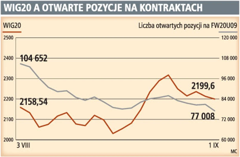 WIG20 przed głębszymi zniżkami w tym miesiącu może bronić fakt, że za trzy tygodnie wygasa wrześniowa seria kontraktów terminowych na indeks. Makler DM BZ WBK ocenia, że inwestorzy, którzy ostatnio wyciągnęli indeks na nowe tegoroczne szczyty, otworzyli też długie pozycje na kontraktach. Wzrostom WIG20 między 19 a 25 sierpnia towarzyszył wyraźny wzrost liczby otwartych pozycji na kontraktach.