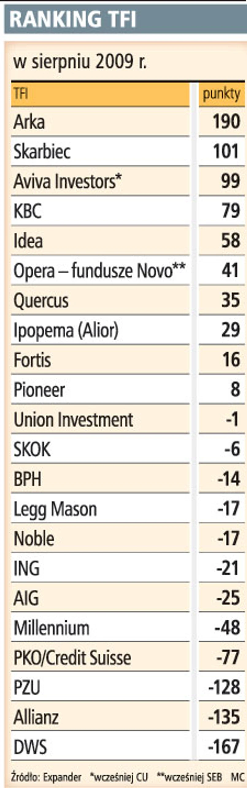 Sierpień najbardziej udany był dla BZ WBK AIB TFI zarządzającego funduszami Arka. Firma zajęła pierwsze miejsce w comiesięcznym podsumowaniu wyników zarządzania GP i Expandera (190 pkt), głównie dzięki funduszom Arka Rozwoju Nowej Europy i Arka Akcji Środkowej i Wschodniej Europy.