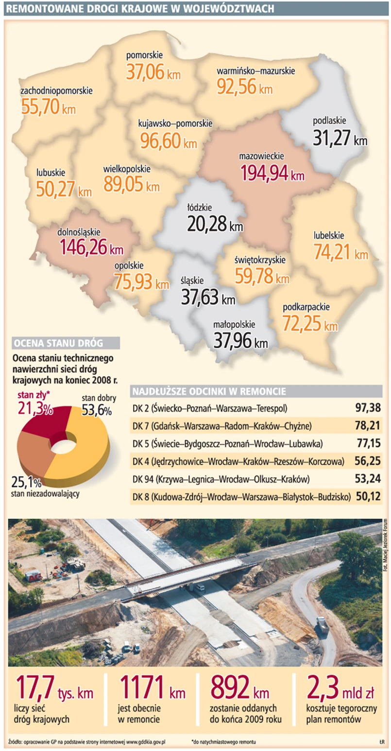 Łatanie dziur, wyrównywanie kolein, wzmacnianie poboczy trwa na 64 trasach. Najwięcej dróg krajowych remontuje się na Mazowszu (niemal 200 km) i Dolnym Śląsku (146 km). Sporo dzieje się na Mazurach (przeszło 90 km) i w opolskim (75 km). Najmniej remontów trwa w województwach: łódzkim (20 km), podlaskim (31 km) i śląskim (37 km). Na Śląsku buduje się za to najwięcej autostrad.