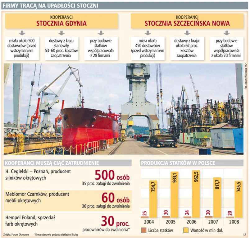 Ponieważ nie jest pewne, kiedy i czy w ogóle stocznie w Gdyni i Szczecinie wznowią produkcję, firmy realizują swoje plany niezależnie. Firma Hempel Poland sprzedawała polskim stoczniom w najlepszych latach 3–4 miliony litrów farb rocznie. To było około 40 proc. sprzedaży. Teraz farb okrętowych nie sprzedaje się w Polsce wcale, z powodu spadku zamówień musiała zwalniać ludzi, ale wcale nie zamyka interesów w Polsce.