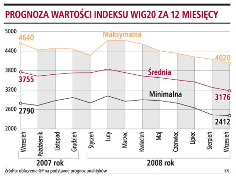 Z wyliczeń GP prowadzonych na podstawie średniej dostępnych nam wycen akcji spółek z WIG20 wynika, że za 12 miesięcy WIG20 może mieć wartość 3175 pkt. Gdy weźmiemy od uwagę najwyższe wyceny, WIG może wynieść 4020 pkt. Dla wycen najniższych wartość indeksu spada do 2412 pkt.
