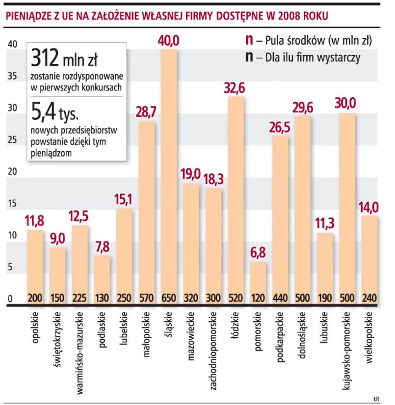Z szacunków MRR wynika, że unijnym wsparciem na założenie własnej firmy może zostać objętych nawet 100 tys. osób. W latach 2008-2015 na ten cel ma zostać wydane ok. 1,4 mld zł. W większości województw ruszyły już konkursy, które mają wyłonić tzw. operatorów, czyli podmioty (uczelnie wyższe, agencje rozwoju itp.), które przygotują pakiet usług dla przyszłych przedsiębiorców. I to właśnie one będą im wypłacać granty inwestycyjne. Jesienią uruchomią pierwsze nabory dla chętnych na założenie własnej firmy.