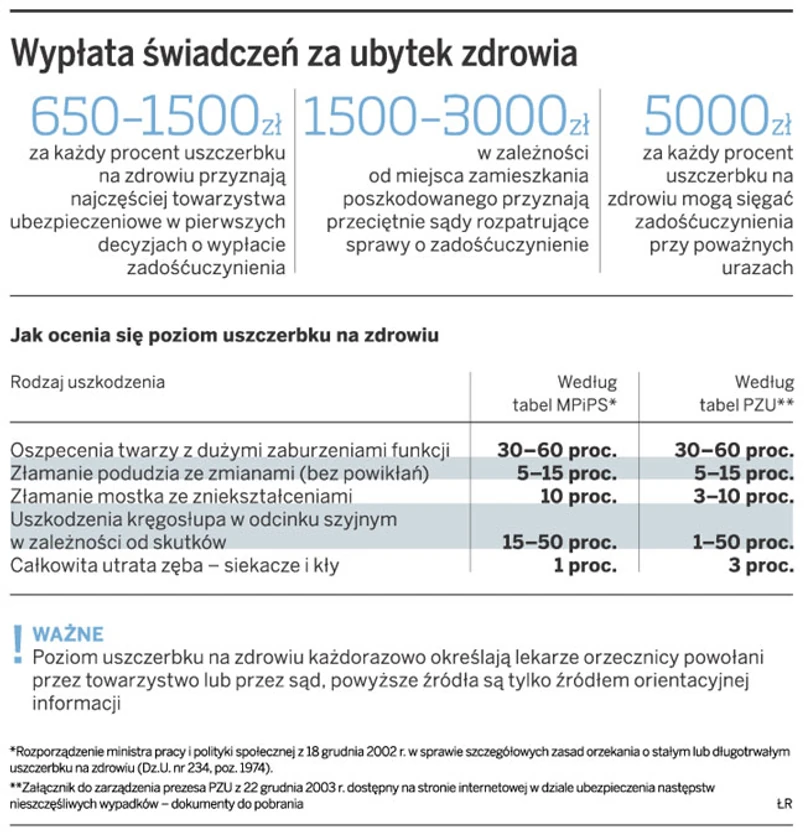 Od 600 zł do 1,5 tys. zł za każdy procent uszczerbku na zdrowiu przyznają ubezpieczyciele poszkodowanym w wypadkach. Jednak w sądzie można wywalczyć nawet trzykrotnie wyższą kwotę