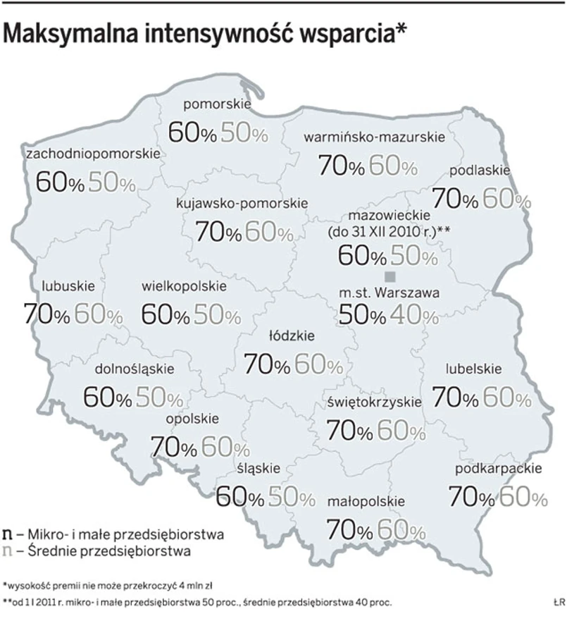 Minimalna i maksymalna wartość kredytu nie zostały w żaden sposób ograniczone. Podstawą wyliczenia premii technologicznej są wydatki kwalifikowane sfinansowane kredytem. Wartość kredytu nie może wynosić więcej niż 75 proc. kosztów kwalifikowanych inwestycji, ponieważ minimum 25 proc. musi wyłożyć przedsiębiorca. Niezależnie od wartości realizowanej inwestycji i kwoty zaciągniętego kredytu technologicznego premia nie może przekroczyć 4 mln zł i ma uwzględniać ograniczenia związane z limitami pomocy publicznej (patrz mapka).