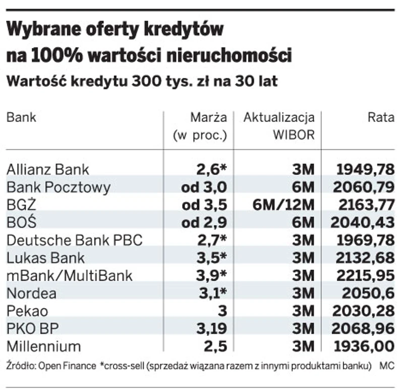Według niego ten ostatni ma w ofercie zaporową marżę przy kredytach mieszkaniowych na 100 proc. wartości nieruchomości (3,9 proc.). Może ona jednak spaść nawet o połowę, jeśli klient założy w MultiBanku konto, zadeklaruje, że będą na nie wpływały jego zarobki, będzie posługiwał się kartą kredytową wydaną przez bank i wykupi dodatkowe ubezpieczenie.