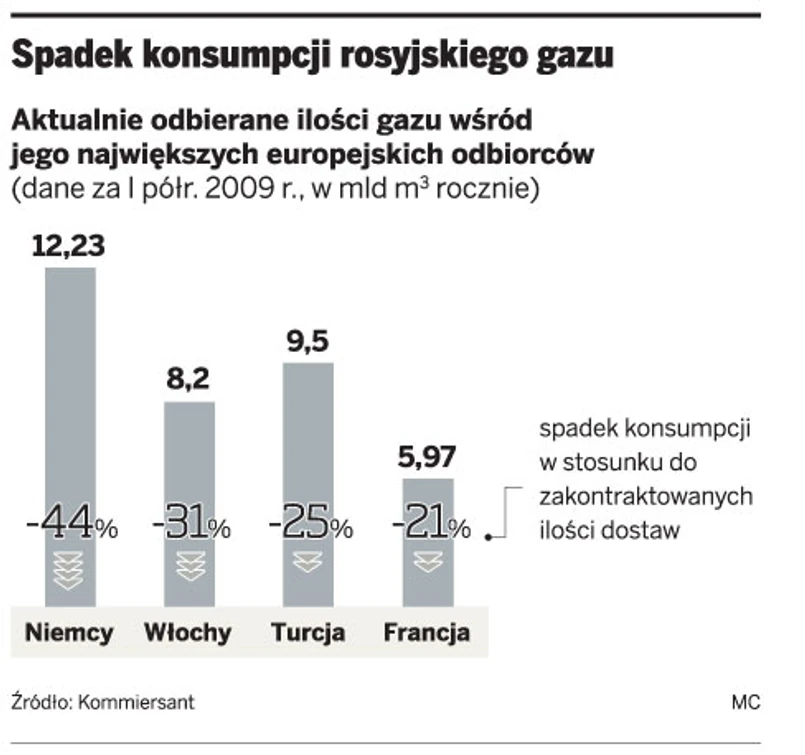 W I połowie 2009 r. popyt na rosyjski gaz spadł w Europie Zachodniej o 29 proc. W sumie kraje z tej części kontynentu odebrały 46 mld m sześc. paliwa (dla porównania Polska w tym okresie kupiła od Gazpromu ok. 3 mld m sześc.).