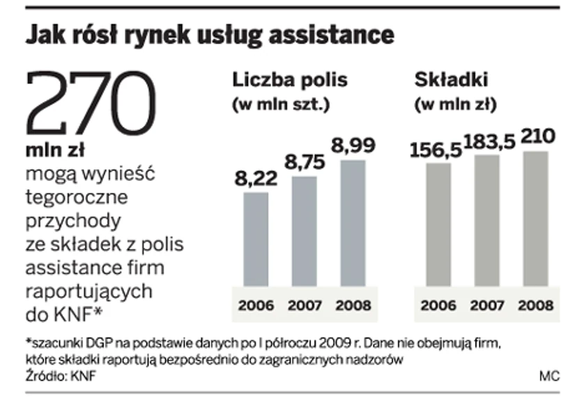 W tym roku przychody raportujących do polskiego nadzoru towarzystw ubezpieczeniowych ze sprzedaży polis assistance sięgną 270 mln zł. Ile będzie wart cały rynek, nie sposób oszacować, bo znaczna część składek trafia do operatorów, którzy podlegają zagranicznym nadzorcom i do nich przesyłają informacje. Na przykład część programów Inter Partner Assistance jest ubezpieczana przez polski oddział belgijskiej spółki ubezpieczeniowej IPA. Z danych KNF wynika, że po I półroczu ubezpieczyciele zebrali z polis assistance o 28 proc. więcej składek niż rok wcześniej. Co ciekawe, równocześnie wzrost liczby polis był bardzo niewielki, zaledwie o 1-proc. Łączna liczba sięga 9 mln sztuk.