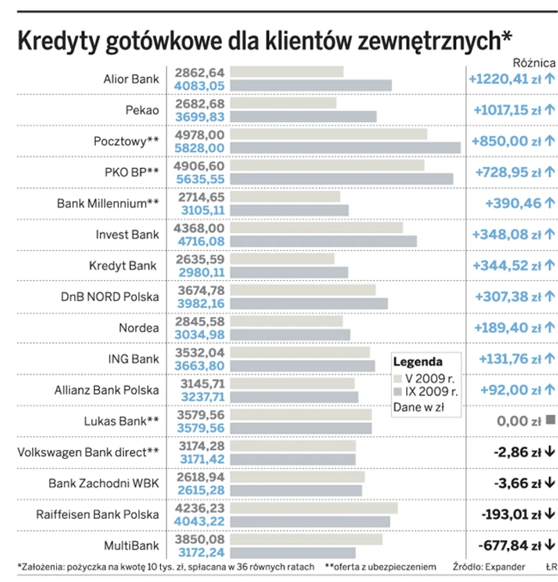 Najdroższe kredyty gotówkowe dla zewnętrznych klientów oferują PKO BP i Bank Pocztowy (łączny koszt to 5,6–5,8 tys. zł). Najbardziej w ostatnich pięciu miesiącach zdrożały pożyczki w Pekao i Alior Banku. Ogólny koszt zwiększył się tam o ponad 1 tys. zł.