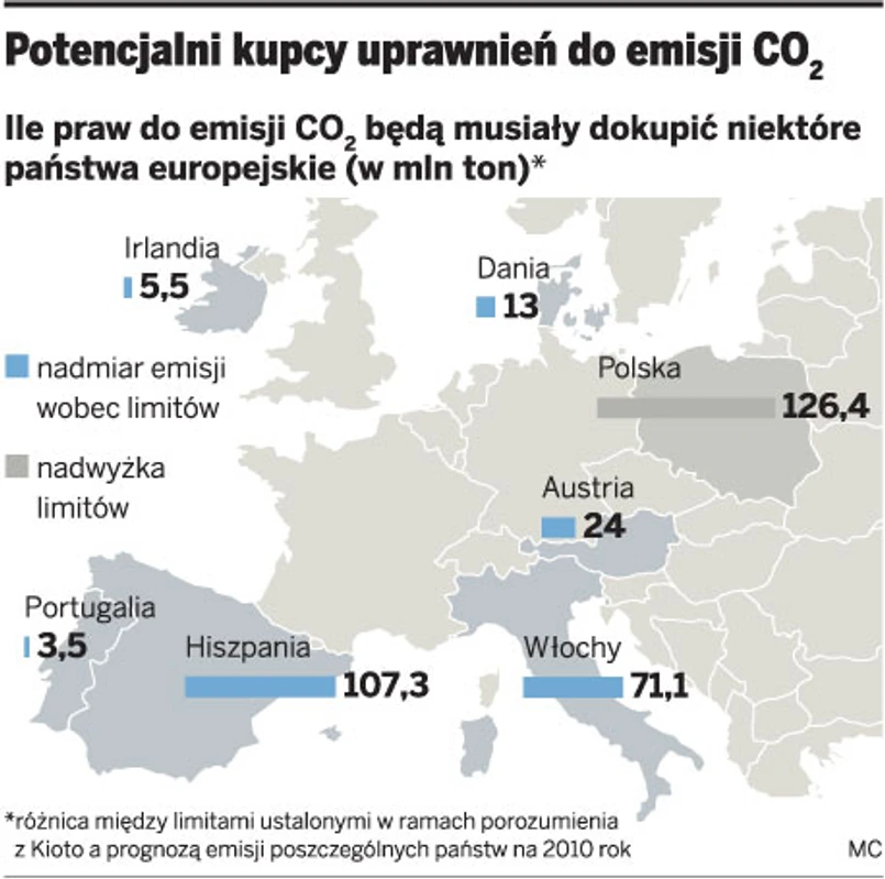 Polska jest bliska sprzedaży uprawnień do emisji dwutlenku węgla w ramach systemu wynikającego z porozumienia z Kioto. Za ponad 100 mln zł limity kupią od nas Hiszpania i Irlandia. Jak mówi DGP Maciej Nowicki, minister środowiska, zakończyły się już negocjacje z kupcami.