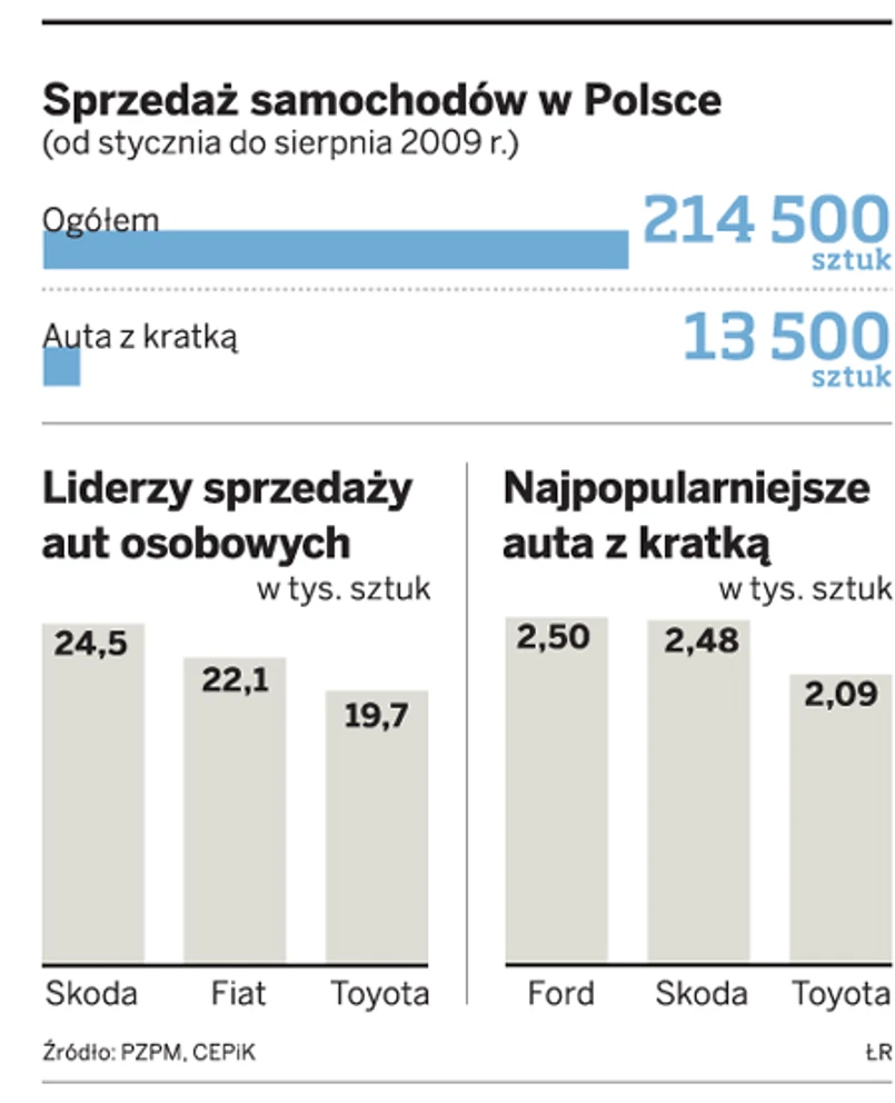 Podobnie jest w przypadku konkretnych modeli aut. Jak podaje instytut Samar, najbardziej popularnym samochodem z kratką nie jest żaden z fordów, lecz skoda octavia. Do tej pory sprzedano w naszym kraju ponad 1,8 tys. tych samochodów, czyli dwa razy więcej niż w tym czasie kupiono fordów mondeo i focusów, drugiego i trzeciego pod względem popularności modelu w rankingu.