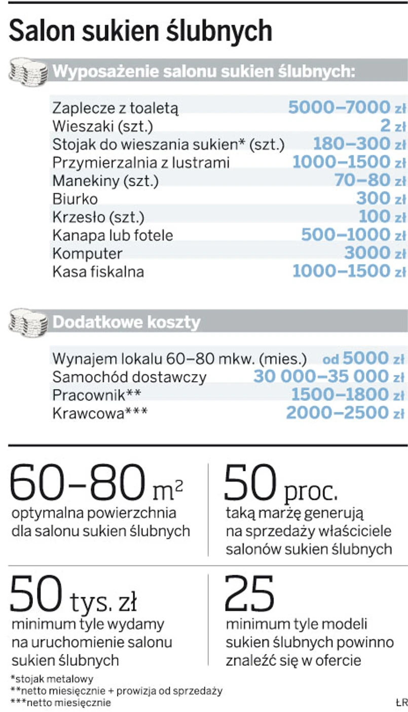 Własny salon sukien ślubnych to dobry biznes także z powodu pieniędzy, jakie zostawiają w nich przyszłe panny młode. Niektóre z nich są gotowe zapłacić nawet 8–10 tys. zł za sukienkę, byle tylko była ona niepowtarzalna i jedyna w swoim rodzaju.