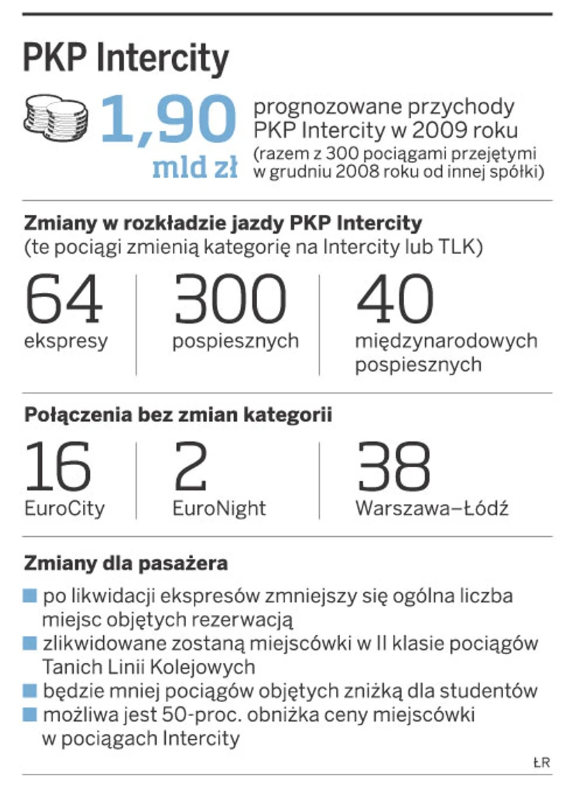 Od poniedziałku pięć innych ekspresów zostanie zamienionych na Intercity: z Warszawy do Bielska Białej, z Warszawy do Krakowa, Przemyśla, Nowego Sącza, z Warszawy do Wrocławia, oraz z Gdyni do Zakopanego. Żeby nie stracić klientów, spółka zamierza obniżyć cenę miejscówek w pociągach intercity z 25 do 10–15 zł.