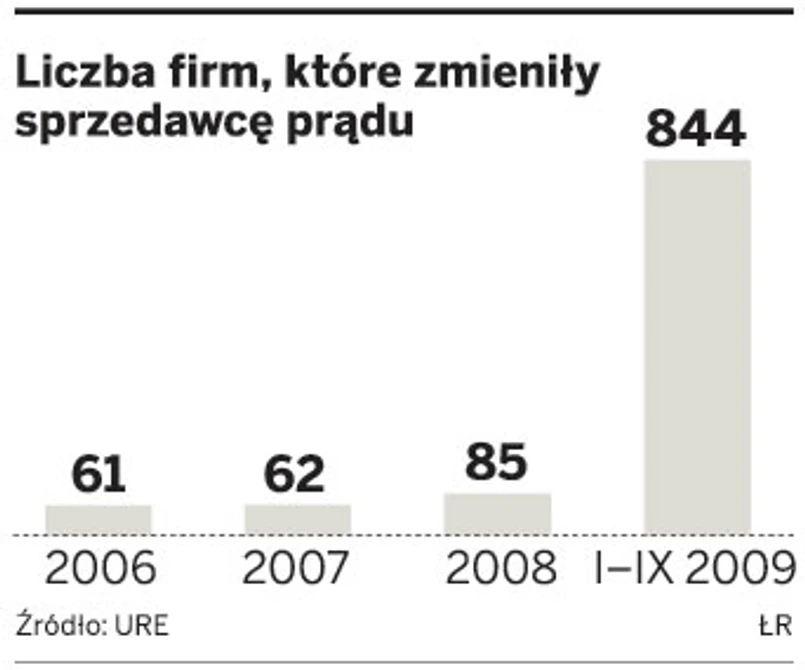 Od początku roku do końca września już 760 firm zmieniło sprzedawcę prądu. Zdecydowało się na to tylko 116 odbiorców indywidualnych. Te liczby nie są oszałamiające, bo w Polsce jest ponad 1,6 mln odbiorców przemysłowych i około 14,5 mln innych, wśród których przeważają gospodarstwa domowe. Niemniej sprzedaż prądu dla odbiorców przemysłowych, którzy podjęli ryzyko zmiany sprzedawcy, jest znacząca na tyle, że pokazuje nowe tendencje na rynku. W ciągu poprzednich pięciu lat (od 2004 r.) na zmianę zdecydowało się łącznie tylko 85 firm.
