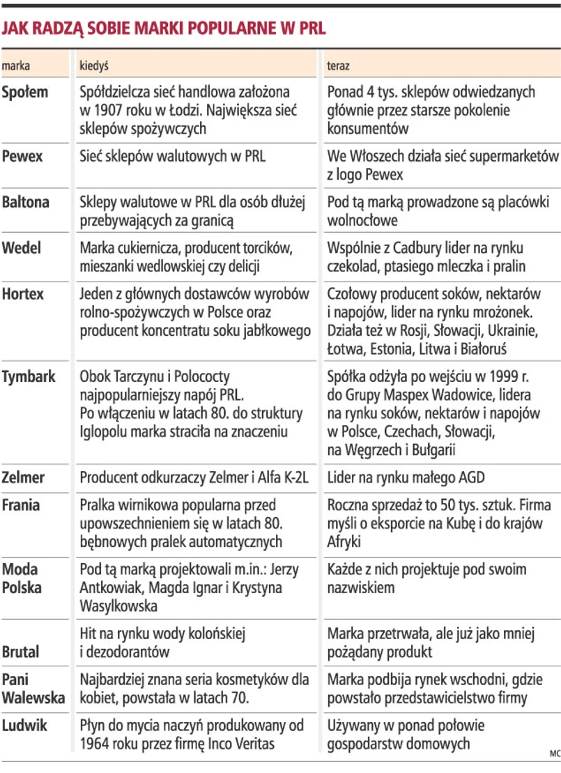 Jako przykład mogą posłużyć też Wedel, który dziś należy do koncernu Cadbury, czy Ludwik, których łączna wartość wyceniana jest na prawie 650 mln zł. Marki te wciąż są liderami w swoich kategoriach.