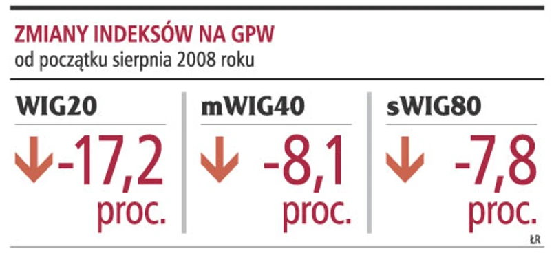 Od początku trwającej ponad rok bessy najgorsze informacje docierały do właścicieli akcji małych i średnich spółek. W kursy właśnie tych papierów najbardziej uderzyło załamanie koniunktury. Od początku lipca 2007 r. indeks małych spółek, sWIG80, stracił ok. 55 proc., a indeks średnich spółek, mWIG40, ok. 60 proc. Znacznie mniejsza jest skala spadku WIG20, indeksu największych i najbardziej płynnych firm, który stracił w tym czasie ok. 40 proc. Jednak od początku sierpnia role się odwróciły. Od tego momentu do połowy września to WIG20 traci więcej niż małe i średnie firmy. Tak samo było 15 i 16 września, kiedy przecena indeksu wyniosła w sumie 7,3 proc., podczas gdy mWIG40 i sWIG80 straciły po 5,9 i 4,7 proc.
